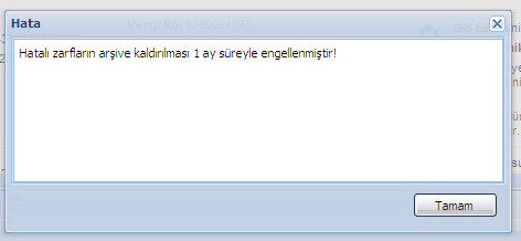 Bazı kullanıcılar maalesef zarf hata verse de hatayı inceleyip hata mesajına ve hata ayrıntısına göre 3148 ve 2614 numaralı soruların cevaplarına bakarak işlem yapmaları gerektiği noktasını atlayıp faturanın alıcıya başarıyla ulaştığını düşünmekteydi. Bu uyarı kullanıcının dikkatini çekmek için gereklilik üzerine koyulmuştur. Bu uyarıdaki 1 aylık süre fatura tarihine göre değil, hata alan zarfın gönderilme tarihine göre hesaplanmaktadır. Zarfınızın gönderilme tarihinden 1 ay sonra faturanızı arşive alabilirsiniz. Hatayı inceleyip hata mesajına ve hata ayrıntısına göre 3148 ve 2614 numaralı soruların cevaplarına bakarak işlem yapınız. |