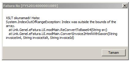 GİB için geçerli olan faturanın (ve uygulama yanıtlarının) GİB üzerinden geçerek 1300 (ya da 1220) kodunu almış ve E-Fatura Görüntüleyici ile görüntülenebilen ve doğrulanabilen XML'idir. Ekteki hata GİB Portal ya da E-Fatura Görüntüleyici'ye ait değildir. Görüntülemek isteyen tarafın programının hangi durumda bu hatayı verdiğini bilememekteyiz. Bu konuyla ilgili olarak 2307 numaralı sorunun cevabına da bakınız. |