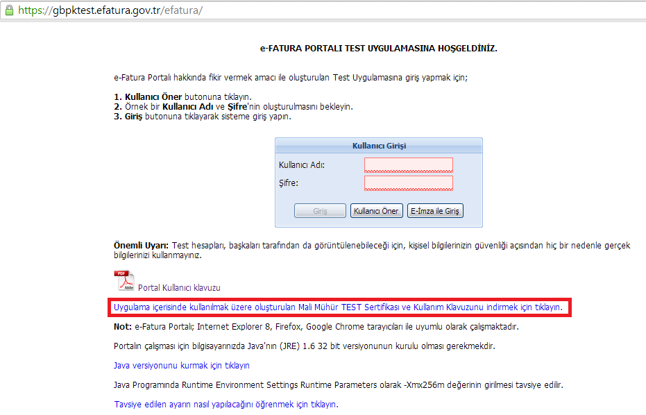 Evet, GİB-Portal test hesabınızda GİB'in sağladığı test mali mühür bilgilerini kullanmanız gerekmektedir. Test ortamına giriş sayfasında bu konuyla ilgili bağlantı bulunmaktadır. |