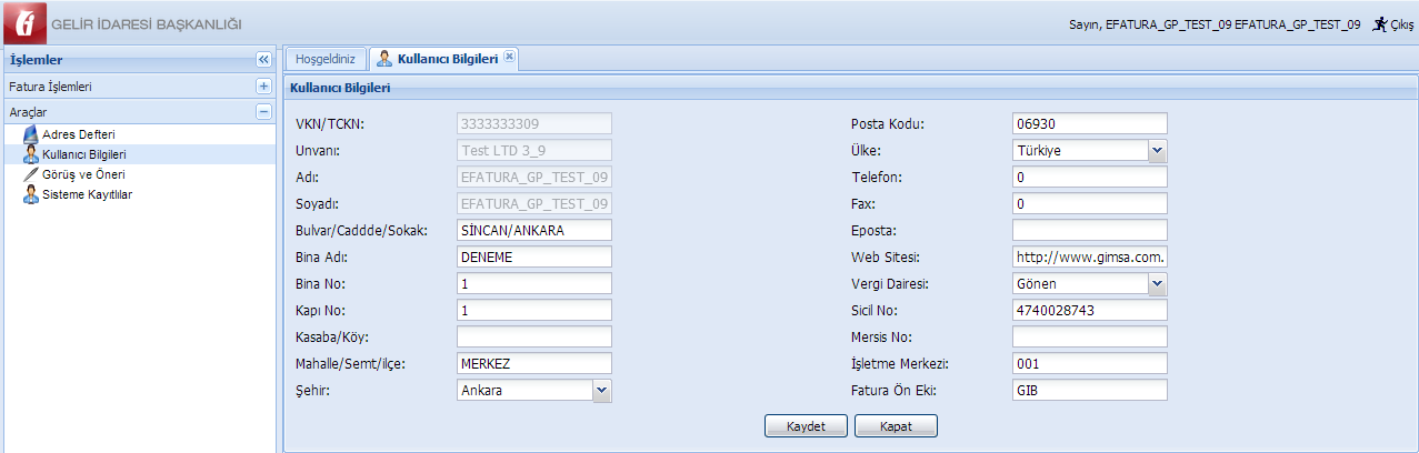 | Ek Bilgi | D0C8750A-AD9D-4BAB-9C4C-DB4A3419DEA5 NOLU test faturasına bakılabilir. | |||||||