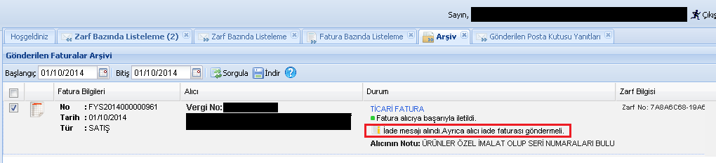 Merhaba, 7A8A6C68-19A6-47B7-B53C-CA1139C9BEFE numaralı zarftaki FYS2014000000961 numaralı faturaya 2014.10.16 13:26:14'te cd2e11b8-1a18-4af1-8431-68a52c89a061 zarfıyla IADE (kabul ya da red değil) yanıtını içeren uygulama yanıtı gönderilmiştir. IADE uygulama yanıtı alıcının göndericiye göndermiş olduğu bir ön bilgilendirme mesajıdır. Bu yanıtın ardından faturanın alıcısı faturaya iade faturası kesmelidir (durum mevzuat hükümlerine uygunsa). İade edilecek fatura için, iade mesajı gönderilsin veya gönderilmesin, iade faturası düzenlenmelidir (durum mevzuat hükümlerine uygunsa). İade mesajı gönderilmese de olur, opsiyoneldir. Gönderilmesi faturayı düzenleyene önceden mesaj gitmesini sağlar. Alıcı iade mesajı göndermesinin ardından iade faturası kesmezse mevcut fatura hala geçerlidir (red cevabı gibi değildir) ve fatura alıcısı tarafından kabul edilmiş sayılır. İyi günler. |
