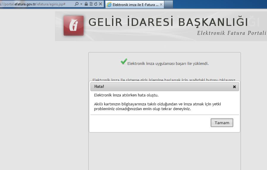 | Soru | Mali mühür ile portala girmek istediğimde ekteki hatayı vermektedir. Elektronik imza atılırken hata oluştu. Akıllı kartınızın bilgisayarınıza takılı olduğundan ve imza atmak için yetki probleminizin olmadığından emin olup tekrar deneyiniz. | |||||||
