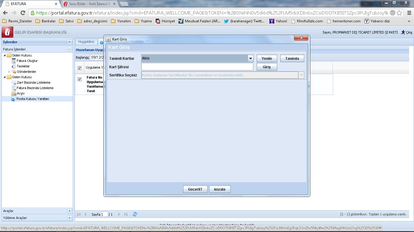 | Soru | E-fatura uygulaması içerisinde gelen ticari faturayı kabul ettik.Kabul mesajını göndermek için onaylama yapmak istediğimizde kart giriş ekranı açılıyor kart tanımlaması ve dosya yolu istiyor. Akis bilgisayara takılı ve aktif vaziyette(Mali mühür ile siteyede giriş yapılmış durumda) onaylamayı yapmıyor.Kart tanımı ve şifresi istiyor ?? Not: tarayıcı ve java ön bellekleri temizlenmiş logları göster açılmıştır. | |||||||