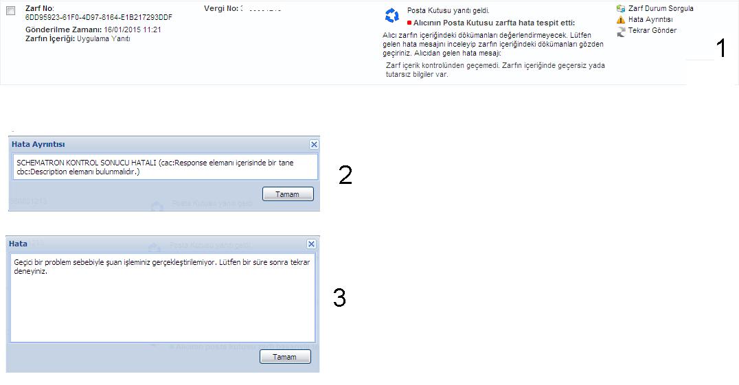 Merhaba, Bu numaralı zarfın durumu: 1230 HEDEFTEN SISTEM YANITI BASARISIZ GELDI(1150:SCHEMATRON KONTROL SONUCU HATALI (cac:Response elemanı içerisinde bir tane cbc:Description elemanı bulunmalıdır.)) Hatalarda 2614 numaralı sorunun cevabına göre işlem yapılmalıdır. Yanıtın alıcısının 3024 numaralı sorunun cevaplarına göre sistemini düzeltmesi ve yeni göndereceğiniz zarfı sorunsuzca (hata vermeden) sistemine alması gerekmektedir. Yanıtın alıcısı bu durumu özel entegratörü ile görüşerek düzeltmelidir. Tekrar Gönder düğmesinde hata vermesi durumu incelenmektedir, tarafınıza bu soru üzerinden tekrar cevap verilecektir. Ardından yanıtın göndericisi Tekrar Gönder düğmesini kullanarak yanıtı tekrar iletmeye çalışmalıdır. İyi günler. |