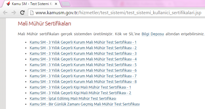 Merhaba, Test ortamında bu işlem için tanımlanmış kullanıcılar bulunmaktadır. Bu kullanıcılara ait mali mühür ve e-imzaları http://www.kamusm.gov.tr/hizmetler/test_sistemi/test_sistemi_kullanici_sertifikalari.jsp [^] bağlantısındaki Mali Mühür Sertifikaları başlığı altındaki sertifikaları kullanabilirsiniz. İyi günler. |
