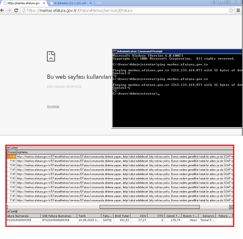 | Soru | Sayin yetkili Gonderdigimiz efaturalar ekteki gibi beklemede kalmaktadir. Explorerdan https://merkez.efatura.gov.tr/EFaturaMerkez/services/EFatura [^] adresine girmek istedigimizde sayfa bulunamadi hatasi gelmekte. Baska internet sitelerine giriste sorun yoktur. komut ortamindan merkez.efatura.gov.tr adresine ping atinca isim cozmekte ve karsimiza 212.133.164.87 adresi gelmektedir. Sanirim sizin tarafta bizim ip adresine erisim ile ilgili bir kisitlama mevcut. Bu konuda yardimlarinizi rica ederiz. Gerekli ek gorsel aciklamalar ektedir. bilgilerinize iyi calismalar. | |||||||