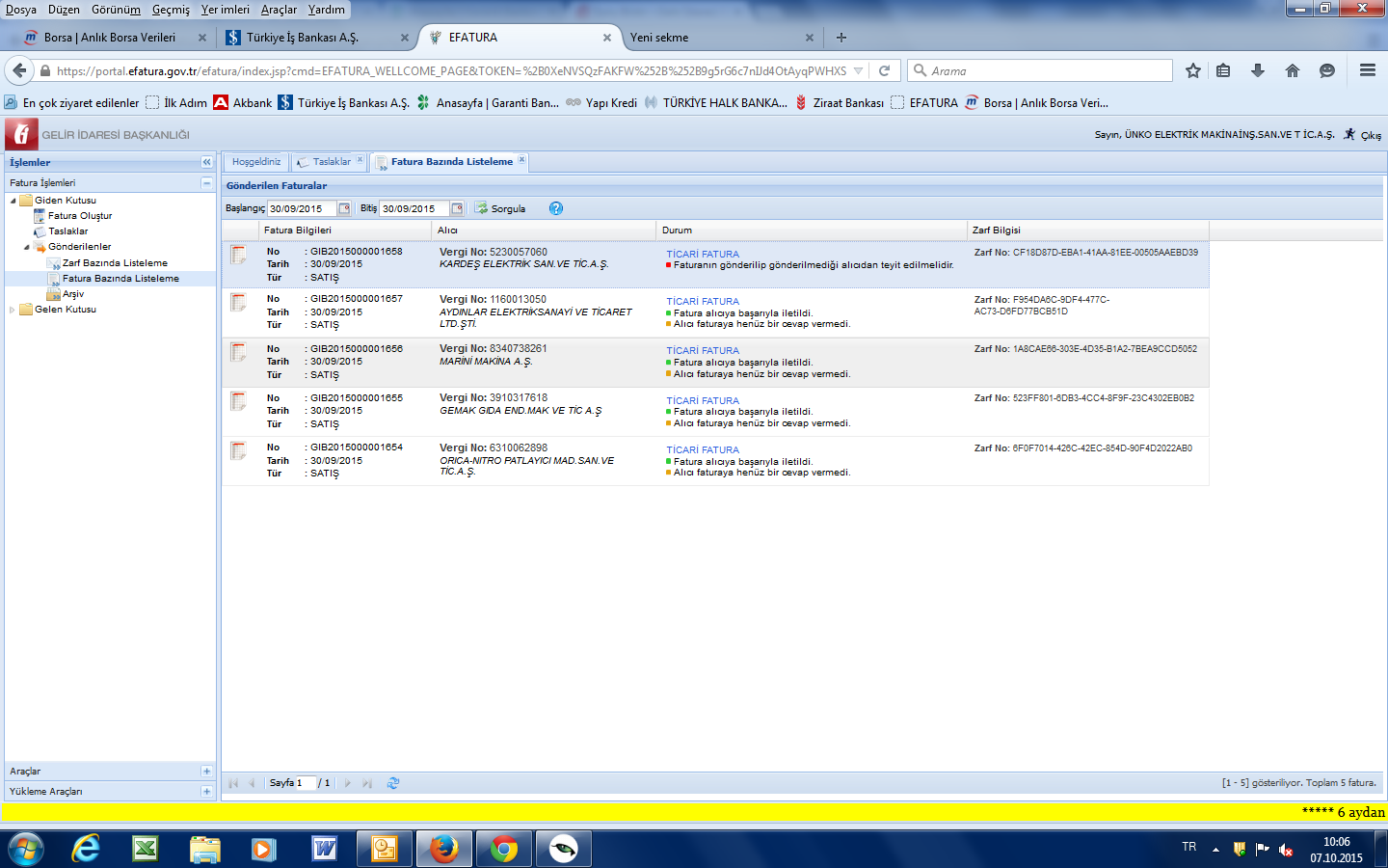 | Soru | Sayın Yetkili 30.09.2015 tarihinde düzenleyip gönderdiğimiz fatura karşı tarafa ulaşmamıştır. .Fatura görüntüsü ektedir. Firma ile görüştüğümüzde faturanın sistemlerine düşmediğini bildirdiler. Bu durumda ne yapmam gerekir.? Saygılarımla | |||||||