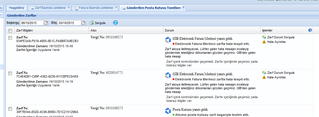 | Soru | Sayın Teknik servis; Sistemlerime düşen iki adet ticari faturayı her zamanki gibi onay yada ret ettim sonrasında da posta kutusu yanıtı gönderdim ancak zark karşı tarafa iletilmedi gözüküyor. Gönderilen posta kutusu yanıtlarını incelediğimde Elektronik fatura merkezi zarfta hata tespit etti şeklinde uyarı almaktayız neden? Dosya ilişiktedir acil geri dönüşünüzü rica ederim. | |||||||