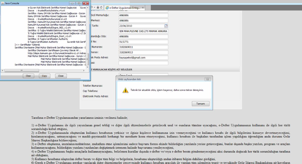 | Soru | Başvuru sırasında bütün işlemleri gerçekleştirdikten sonra, imzala seçeneğini tıkladığımızda teknik hata mesajı ile karşılaşıyoruz. java loglarında herhangi bir hata görülmüyor. ancak ekranda "teknik bir aksaklık oldu işlem başarısız daha sonra tekrar deneyiniz" yazıyor. bu mali mühüt için 4-5 defa farklı bilgisayarlardan denedik olmadı. daha önce başka mali mühürle başarılı olduğumuz bilgisayar üzerinden bu mali mühür ile başvurumuz hata alıyor. Hata ekranı görüntüsü ektedir. | |||||||