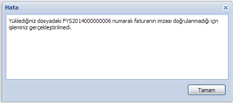 Faturanızın imzasının doğrulanabilmesi gerekmektedir. Bu konuyu faturanızı oluşturduğunuz programın yazılımcısıyla görüşmelisiniz. |