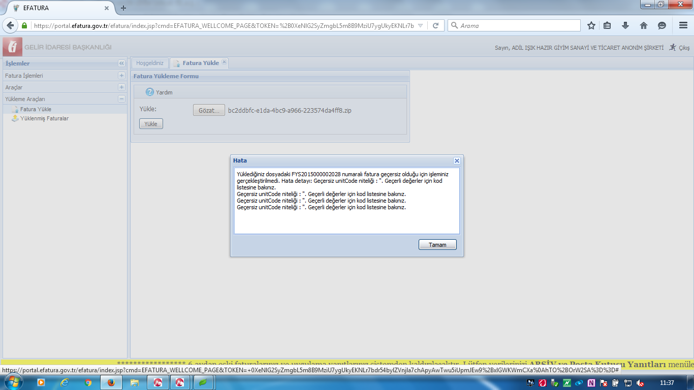 | Soru | Merhaba, Sisteme yüklemeye çalıştığımız faturada aşağıdaki hatayı alıyoruz. Bu hata neden kaynaklanıyor olabilir. Yüklediğiniz dosyadaki FYS2015000002028 numaralı fatura geçersiz olduğu için işleminiz gerçekleştirilemedi. Hata detayı : geçersiz unitCode niteliği:"geçerli değerler için kod listesine bakınız. Teşekkürler. | |||||||