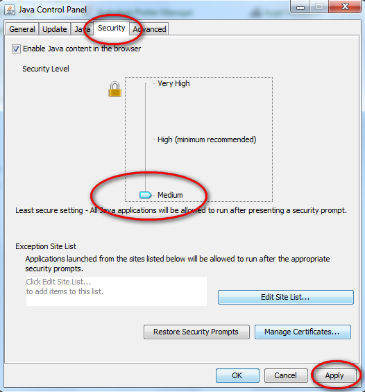 Merhabalar; Ekran görüntüsünde görülen Java Control Panel'inde "Security" sekmesinde bulunan "Security Level" kısmını işaretlendiği gibi "Medium" seviyesine indiriniz. Sorunsuz çalışacaktır. İyi çalışmalar.. |