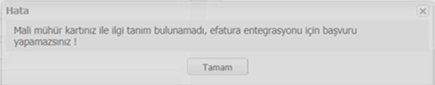 | Soru | Portale giriş yapamıyorum. “Mali mührünüz tanımlı değil. Entegrasyon için başvuru yapamazsınız.” Hatası alıyorum. Ne yapmalıyım? | |||||||
