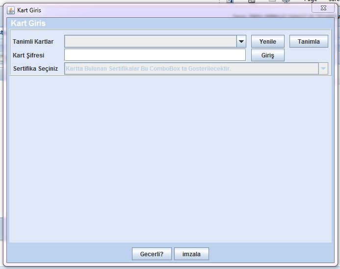 | Soru | Merhaba, seçili faturayı onayla butonuna basarak onaylamak istediğim zaman "Kart Giriş" ekranı geliyor. Bu ekrandada Tanım Kartlar ve Kart Şifresi kutuları boş gözüküyor. Ancak Akia v4.1 kurulu olan akis programını açtığımda kart okuyucuyla ilgili kart bilgilerine ulaşabiliyorum. Bu nedenlerden dolayı faturalarımızı onaylayamıyoruz. Bu problemi nasıl çözebiliriz? Teşekkürler. | |||||||
