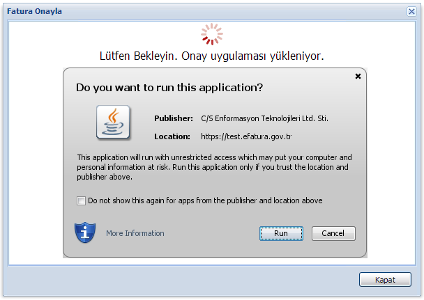 Merhaba, Kullanıcınıza özel bir engelleme ya da değişiklik mevcut değildir. Bu sorunun birkaç sebebi olabilir: - Kullanıcı dizininizdeki (Örn: C:\Users\KULLANICI_ADI\crls\) crls klasörünün altındaki (klasörün kendisini silmemelisiniz) ".crl" uzantılı dosyaları siliniz. Burayı temizlemeniz halinde bir sonraki Portale girişinizde sadece gerekli olan dosyalar indirilecektir. - Java - Javanın çalışmasına izin verin (fark etmeden engellemiş olabilirsiniz 368 numaralı sorunun cevabına bakabilir, ekteki resimdeki işlemleri uygulayabilirsiniz) - Java 32 bit yüklü olmalı (64 değil) - Javanın 1.7.0_65 sürümünü yüklemeniz faydalı olacaktır (Java 1.6.32 ve üstü bir sürümünün olması genellikle yeterli olabilmektedir). - Birden fazla Java'nın yüklü olduğu durumda sorun yaşanabilmektedir. Javanın iki veya daha fazla sürümü aynı anda kurulu ise hepsini silin, sadece bir tane sürümünü kullanınız. (327 numaralı sorunun cevabındaki java sürümünü kullanabilirsiniz.) - Java sürümünü buna göre kontrol ettikten sonra Java belleğini temizleyiniz - 331 numaralı forum sorusunun cevabından yararlanabilirsiniz - Java loglarını görünür hale getirmeniz sorunla ilgili ipuçları verebilir - 330 numaralı forum sorusunun cevabından yararlanabilirsiniz - Kart Tanımı - Kart tanımı eksik/yanlış yapılmış olabilir. - 355 numaralı forum sorusunun cevabına göre durumu kontrol edebilirsiniz - Tarayıcı - Tarayıcınızın Java'nın çalışmasını engellemediğinden emin olunuz. (Google Chrome engellemektedir. Mozilla firefox tarayıcısında Java engellemesinin kaldırılması için ek işlem yapmanız gerekebilir.) - Mozilla Firefox tarayıcısını kullanabilirsiniz - Tarayıcınızın belleğini temizleyiniz - Bilgisayar - Bilgisayarınızda birbirini olumsuz etkileyen, Java'nın çalışmasını engelleyen uygulamalar olabilir - Güvenlik - Bilgisayarınızdaki güvenlik ayarları (antivirüs programı) Java'nın çalışmasını engelliyor olabilir - İnternet - İnternet bağlantısında sorun olabilir Windows 8 ve 10 da şu şekilde işlem yapmanız gerekebilir: 1. System Configuration'a girilir.(MSCONFIG - Windows tuşuna basıp "msconfig" yazıp ve enter'a basınız.) 2. Startup tabına gelinir. 3. Open task manager açılır. 4. Java Update Scheduler disable edilir. 5. Bilgisayar yeniden başlatılır. 6. Fatura doğrularken en son Onayla'da takılırsa uygulama ekranının odağı kaybolmuş (lost focus) olabilir. Alt tab ile deneyiniz. Internet explorer 8 windows 7 kullanıldığı durumda ekranda donma oluyorsa aşağıdaki işlemleri uygulayınız: 1. user.home crl klasörünün içindeki crl'ler silinir (klasörün kendisi değil, sadece içindekiler) 2. IE8 internet seçeneklerinde güvenlik tabına gelinir Korumalı Modu Etkinleştir'i kaldırılır. IE8 kapatılıp açılır, onaylama işlemi tekrarlanır. 3. Sorun devam ederse güvenlik düzeyi en alt düzey olan orta'ya çekilir. IE8 kapatılıp açılır, onaylama işlemi tekrarlanır. 4. Sorun devam ederse IE8 eski versiyon java'yı blokluyor olabilir. Java son sürüme geçilir. IE8 kapatılıp açılır, onaylama işlemi tekrarlanır. 5. Sorun devam ederse IE8 den daha üst versiyona geçilir. IE8 kapatılıp açılır, onaylama işlemi tekrarlanır. 6. Sorun devam ederse başka tarayıcıya geçilir. Sorunun devamı halinde farklı bir internet ağındaki bilgisayar üzerinden işlem yapmayı deneyiniz. Örnek bir fatura onaylama süreci ekteki resimlerde gösterilmiştir. Ayrıca 858 numaralı soruda yeni oluşturulan bir faturanın onaylanma ve gönderilme aşamaları resimli olarak anlatılmıştır. İyi günler. Bu forum sitesinde yazılanlar özelge niteliği taşımamakta olup sadece mükelleflerimize yardımcı olma amaçlıdır. |