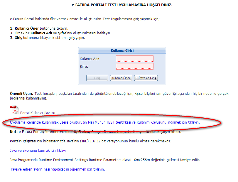 Merhabalar; efatura.gov.tr adresinde bulunan paketler içerisinde örnekler mevcuttur. Ayrıca imzalamak için https://test.efatura.gov.tr/efatura/login.jsp [^] adresinde bulunan ekran görüntüsünde gösterilen örnek sertifikayı indirip test amaçlı kullanabilirsiniz. İyi çalışmalar.. |