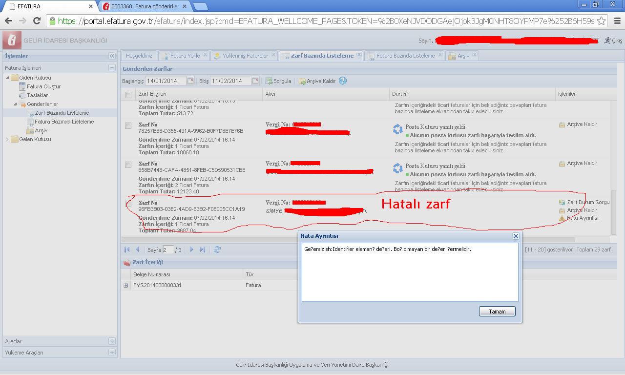 Hata ayrıntısında da yazdığı üzere: "GİB Elektronik Fatura Merkezi yanıtı geldi. Elektronik Fatura Merkezi zarfta hata tespit etti. Zarf alıcıya iletilmeyecek. Lütfen gelen hata mesajını inceleyip göndermek istediğiniz faturaları gözden geçiriniz. GİB'den gelen hata mesajı: Zarf içerik kontrolünden geçemedi. Zarfın içeriğinde geçersiz yada tutarsız bilgiler var." Bu konu ile ilgili olarak 3148 numaralı sorunun cevabına bakınız. Soru sormadan önce “SORULARI GÖRÜNTÜLE” sayfasındaki “ARA/Filtrele” bölümünden arama yapınız. Bu şekilde soru sormaksızın çözüme çok daha hızlı bir şekilde ulaşabilirsiniz. |