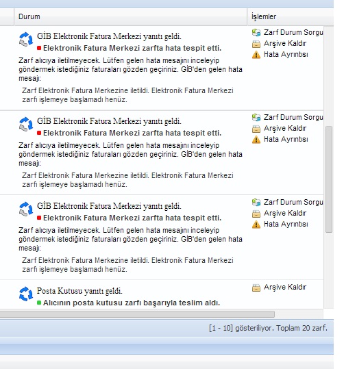 | Soru | ZARFLADIĞIM FATURALARI GİB PORTAL ÜZERİNDEN SİSTEME YÜKLEDİM FAKAT EKTEKİ RESİMDE GÖRÜNDÜĞÜ GİBİ ZARFTA HATA BULUNDU YANITI VERİYOR SORUNU NASIL ÇÖZERİM? |