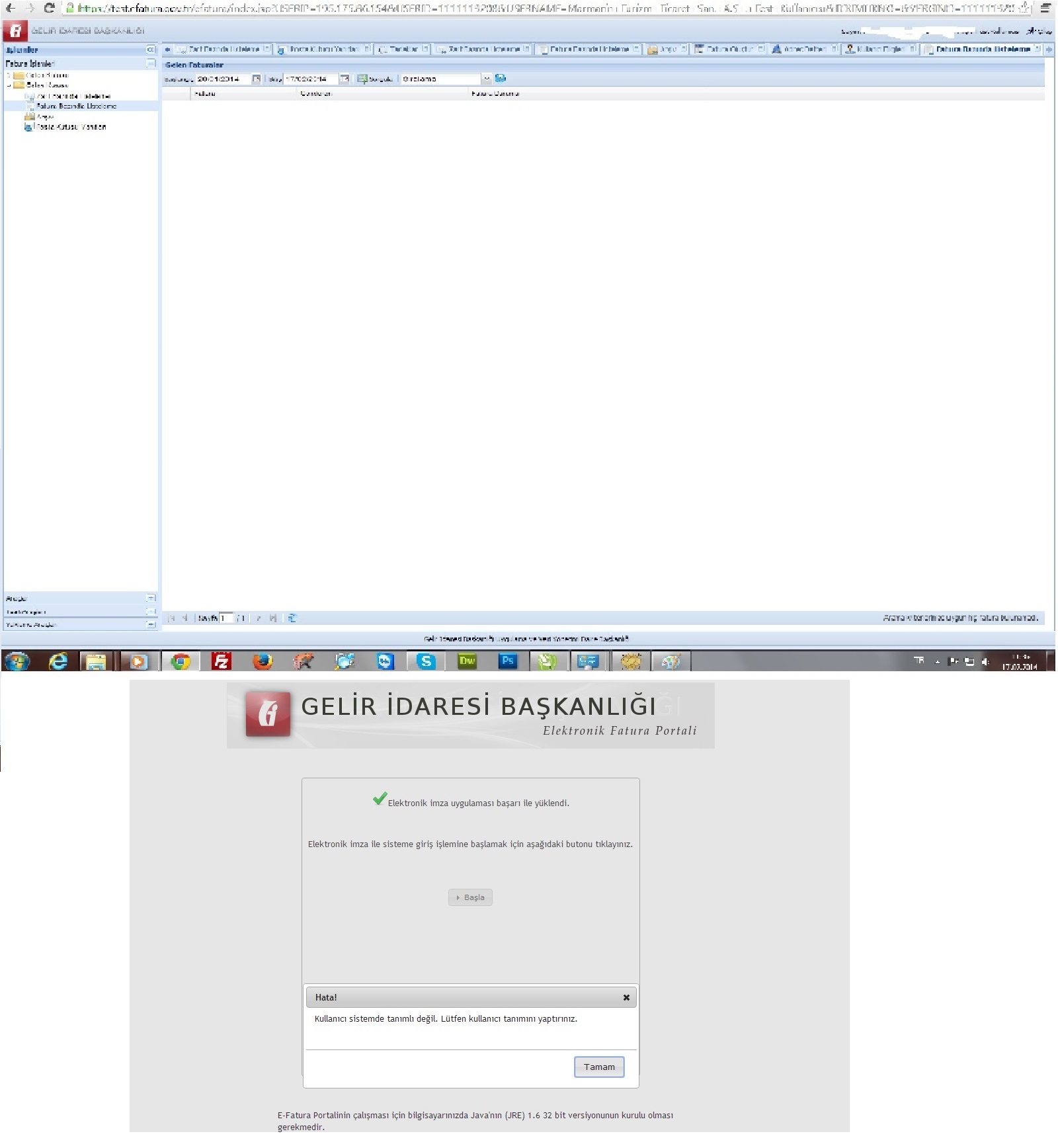 | Soru | Merhaba Gib' den gelen kullanıcı adı şifre ile test ekranına giriş yapabiliyorum fakat hiç bir faturayı listeleyemiyorum. Elektronik imza ile giriş yapmayı denediğimde Kullanıcı sisteme tanımlı değil diye bir mesaj alıyorum ek'te resimler. | |||||||