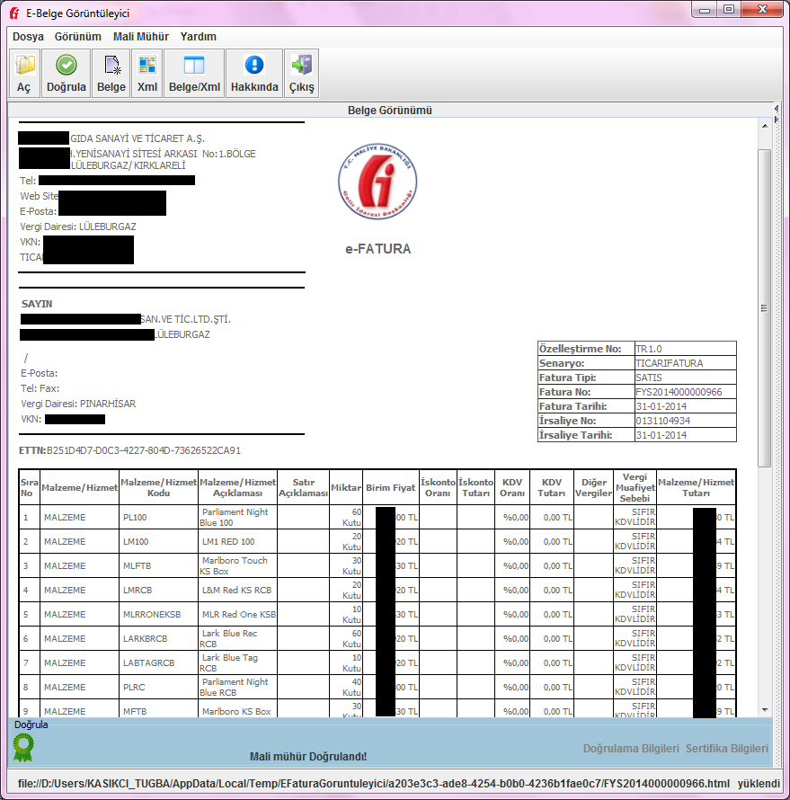 D08691C6-8C91-420B-A37E-944BFCB49DB5 zarf ID'li fatura ekteki gibi E-Fatura Görüntüleyici programı ile görüntülenebilmektedir. E-Fatura Görüntüleyiciyi programının son halini kullanmıyor olabilirsiniz. Sistemde gelişmeler oldukça (şema kontrol değişiklikleri vs.) E-Fatura Görüntüleyici programı da güncellenmektedir. Fatura GİB üzerinden geçerken hata almadığı (1215,1230 vs), E-Fatura Görüntüleyici programı ile görüntülenebildiği ve doğrulanabildiği için geçerlidir ve tekrar gönderimi durumunda mükerrer gönderim olacaktır. "...gönderdikleri faturanın ING Bank sistemi dışında GİB’in kendi fatura görüntüleyicisinde de göremediğinizin (ekte 2.resim) bilgisini vererek hatanın kendilerinden kaynaklandığı bilgisini vermenizi rica ederiz..." denilmiş. GİB Portalinde ve E-Fatura Görüntüleyici programında görüntülenemeyen ancak bunlar haricinde görüntülenebilen bir fatura geçerli değildir. Bu fatura için sorun yok ancak şunun bilinmesi gerekmektedir; faturanın geçerli olabilmesi için; - GİB üzerinden geçerken hata almaması (1215,1230 vs), - E-Fatura Görüntüleyici programı ile görüntülenebilmesi ve doğrulanabilmesi gerekmektedir. (Faturanın portalde de görüntülenebilmesi gerekmektedir.) - Faturayla ilgili mevzuat hükümleri de geçerlidir. Eğer bu fatura gönderdiğiniz resimdeki gibi açılamasaydı bu durumda alıcının fatura XML'indeki bilgilere göre iade faturası kesmesi ve göndericinin doğru şekilde faturayı oluşturup göndermesi gerekecekti. Hatasız bir gönderim için göndericinin faturaları oluşturduktan sonra zarflayıp, daha sonra zarftan çıkarıp E-Fatura Görüntüleyicide açtıktan ve doğruladıktan sonra göndermesi gerekmektedir. Bu konu ile ilgili olarak 5000 numaralı sorunun cevabına bakabilirsiniz. Hatırlatma: Ana sayfada ve forum kullanım kılavuzunda uyarısı yapılan şu konuya dikkat ediniz: İçerisinde (soruda / eklerde) unvan ya da kişisel/kurumsal bilgilerin geçtiği soruları lütfen ÖZEL olarak işaretleyerek sorunuz. |