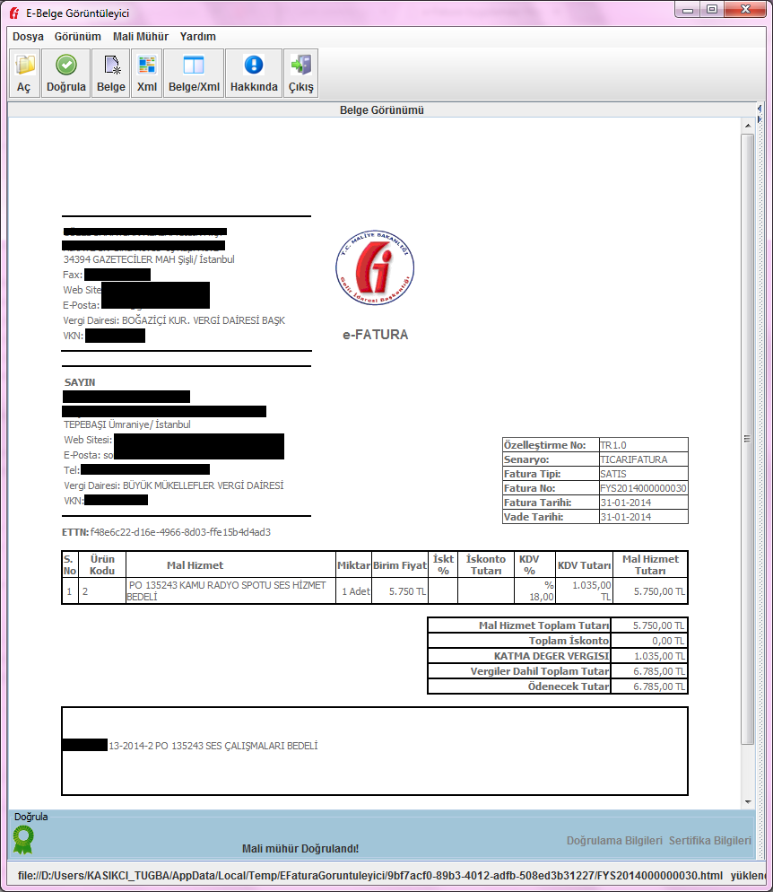 Entegrasyon Kılavuzu dokümanında yer aldığı üzere: XML dosyaları içinde görüntüleme amacı ile kullanılacak olan XSLT tanımı mutlaka bulunmalıdır. Bu faturaya ait XSLT faturanın XML'i içinde gömülüdür ve faturalarda bu şekilde gömülü olmalıdır. İlgili alan: <cac:AdditionalDocumentReference> <cbc:ID>7d03ecdd-de86-4950-b5a8-1dfb4e279626</cbc:ID> <cbc:IssueDate>2014-01-31</cbc:IssueDate> <cbc:DocumentType>XSLT</cbc:DocumentType> <cac:Attachment> <cbc:EmbeddedDocumentBinaryObject characterSetCode="UTF-8" encodingCode="Base64" filename="FYS000000183.xslt" mimeCode="application/xml">.........</cbc:EmbeddedDocumentBinaryObject> </cac:Attachment> </cac:AdditionalDocumentReference> Söz konusu fatura ekte görülebileceği gibi E-Fatura Görüntüleyici ile görüntülenebilip doğrulanabilmektedir. Faturanın durumu da 1300 BASARIYLA TAMAMLANDI olduğu için bu fatura geçerlidir. |