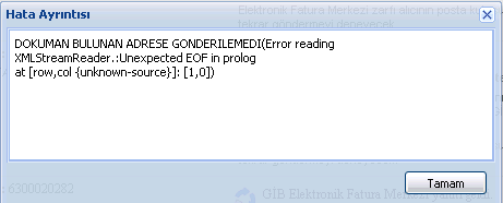 Hatanın durumu: 1210 DOKUMAN BULUNAN ADRESE GONDERILEMEDI(XXX) 1210 DOKUMAN BULUNAN ADRESE GONDERILEMEDI(XXX) (ya da 1215 DOKUMAN GONDERIMI BASARISIZ. TERKAR GONDERME SONLANDI.(XXX)) hatasında XXX bilgisi alıcının sisteminin verdiği hatadır. GİB alıcının sistemine zarfı ulaştırmaya çalışılırken alıcı tarafından XXX mesajı alınmıştır. GİB gönderici ile alıcı arasında aracıdır. Alıcının sistemindeki bu mesajı göndericiye olduğu gibi iletmektedir. Öncelikle alıcı sistemindeki sorunu gidermelidir. Ardından 1210 ve 1215 durumları ile ilgili olarak 2614 numaralı sorunun cevabına göre işlem yapılmalıdır. Hata ayrıntıları, daha sonra karşılaşabileceğiniz hata durumları ve yapmanız gerekenlerle ilgili olarak 2614 numaralı soruya bakınız. |