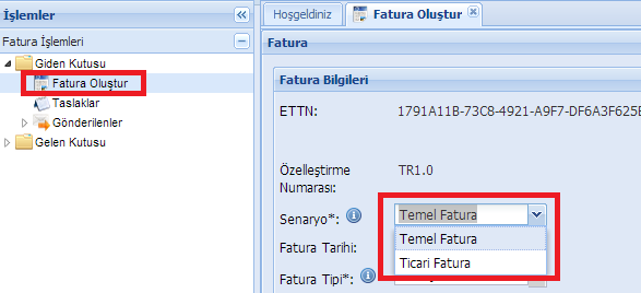 1- Entegrasyon yöntemini değil, Portal yöntemini kullanmaktasınız. (Faturanızı oluştururken portal haricindeki bir program kullansanız bile) 2- Faturalarınız portalde "Fatura Oluştur" bölümünden oluşturuyorsanız ekteki resimde olduğu gibi "Temel Fatura"yı seçerseniz temel, "Ticari Fatura"yı seçerseniz ticari fatura oluşturursunuz. Faturanızı portal dışındaki bir program ile oluşturuyorsanız (FYS ile başladığına göre bu şekilde yapmaktasınız) bu konuyu program sağlayıcılarınızla görüşmeniz gerekmektedir. Temel/Ticari fatura ayrımı ile ilgili olarak 930 ve 1616 numaralı soruların cevaplarına bakınız. |