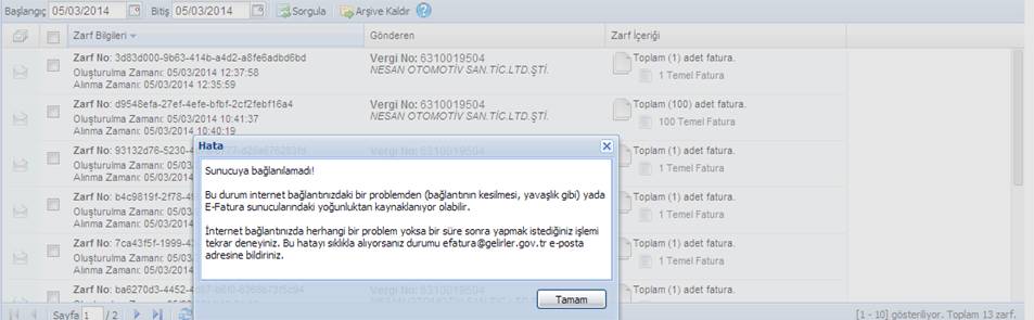 Merhabalar, Sistemsel bir sıkıntı yoktur. Lütfen hata detayındaki uyarıları dikkate alınız. “SORULARI GÖRÜNTÜLE” sayfasındaki “ARA/Filtrele” bölümünden arama yapabilirsiniz. Bu şekilde soru sormaksızın çözüme çok daha hızlı bir şekilde ulaşabilirsiniz. İyi çalışmalar. |