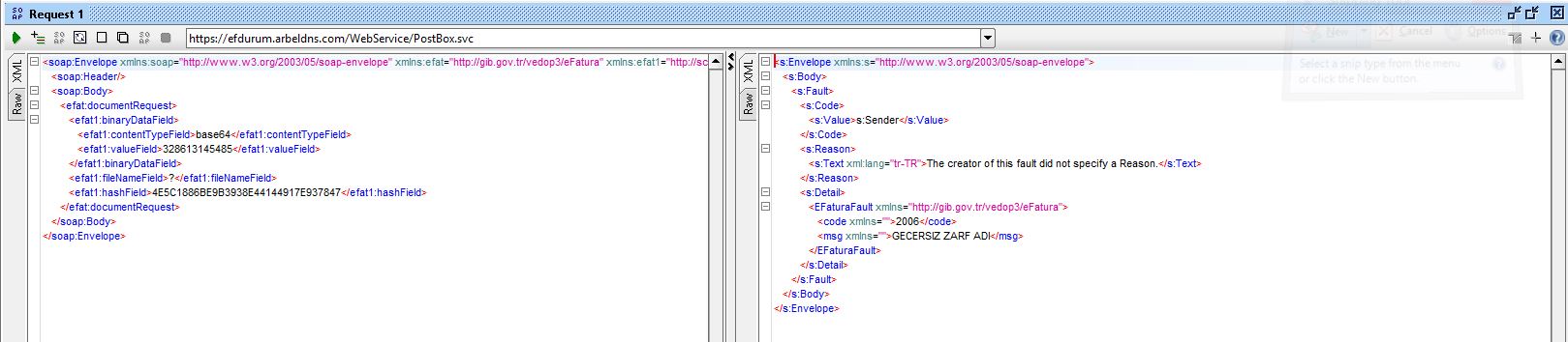 Vermiş olduğunuz cevap bizim durumumuza uymamaktadır. SOAPUI ile webservisimizi test ettiğimizde aşağıdaki gibi bir yanıt aldığımızı görebilmekteyiz. Lütfen sorunun nereden kaynaklanabileceği ile ilgili detaylı bilgi verebilir misiniz? <s:Envelope xmlns:s="http://www.w3.org/2003/05/soap-envelope"> [^] <s:Body> <s:Fault> <s:Code> <s:Value>s:Sender</s:Value> </s:Code> <s:Reason> <s:Text xml:lang="tr-TR">The creator of this fault did not specify a Reason.</s:Text> </s:Reason> <s:Detail> <EFaturaFault xmlns="http://gib.gov.tr/vedop3/eFatura"> [^] <code xmlns="">2006</code> <msg xmlns="">GECERSIZ ZARF ADI</msg> </EFaturaFault> </s:Detail> </s:Fault> </s:Body> </s:Envelope> |
