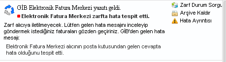 Zarfın bilgisi: Zarfın durumu : HEDEFTEN SISTEM YANITI BASARISIZ GELDI(1160:1160 (XML SEMA KONTROLUNDEN GECEMEDI)) Zarfın durum kodu: 1230 Yeniden fatura oluşturup göndermeniz gerekmektedir. İyi çalışmalar. |