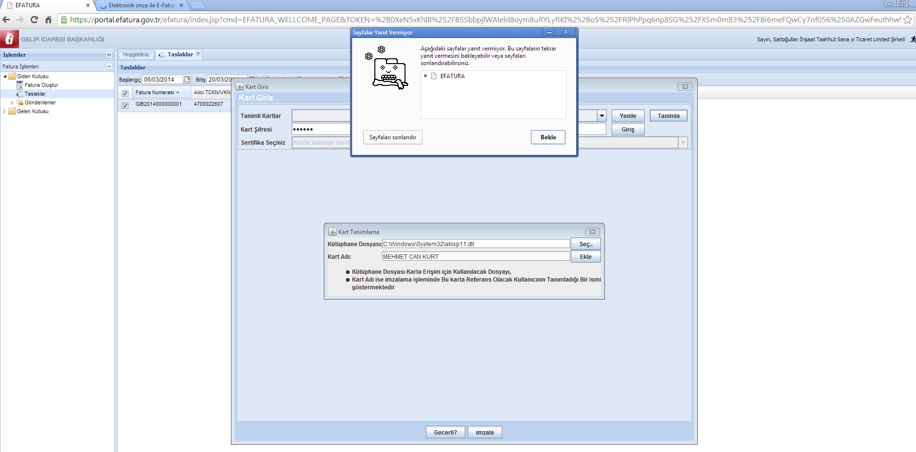 | Soru | taslak olarak kaydettiğim faturayı onayla butonuna bastıktan sonra karşıma kart bilgisi gelmiyor tanımla menüsünden akis11.dll olarak tanımlıyorum ve ekle butonuna bastığımda sayfadan yanıt alamadı bekle veya sonlandır şeklinde uyarı mesajı alıyorum bunu 3 farklı bilgisayar da ve 3 farklı internet hattında denedim sorunum çözülmedi | |||||||