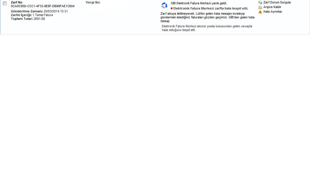 | Soru | e- fatuta gönderiminde ''ELEKTRONİK FATURA MERKEZİ ALICININ POSTA KUTUSUNDAN GELEN CEVAPTA HATA OLDUĞUNU TESPİT ETTİ '' şeklinde bir hata ile karşılaştık. göndermiş olduğumuz e-fatura teslim edilebilr mi ? yoksa e- faturayı tekrar oluştup göndermelimiyiz. teşekkürler... | |||||||