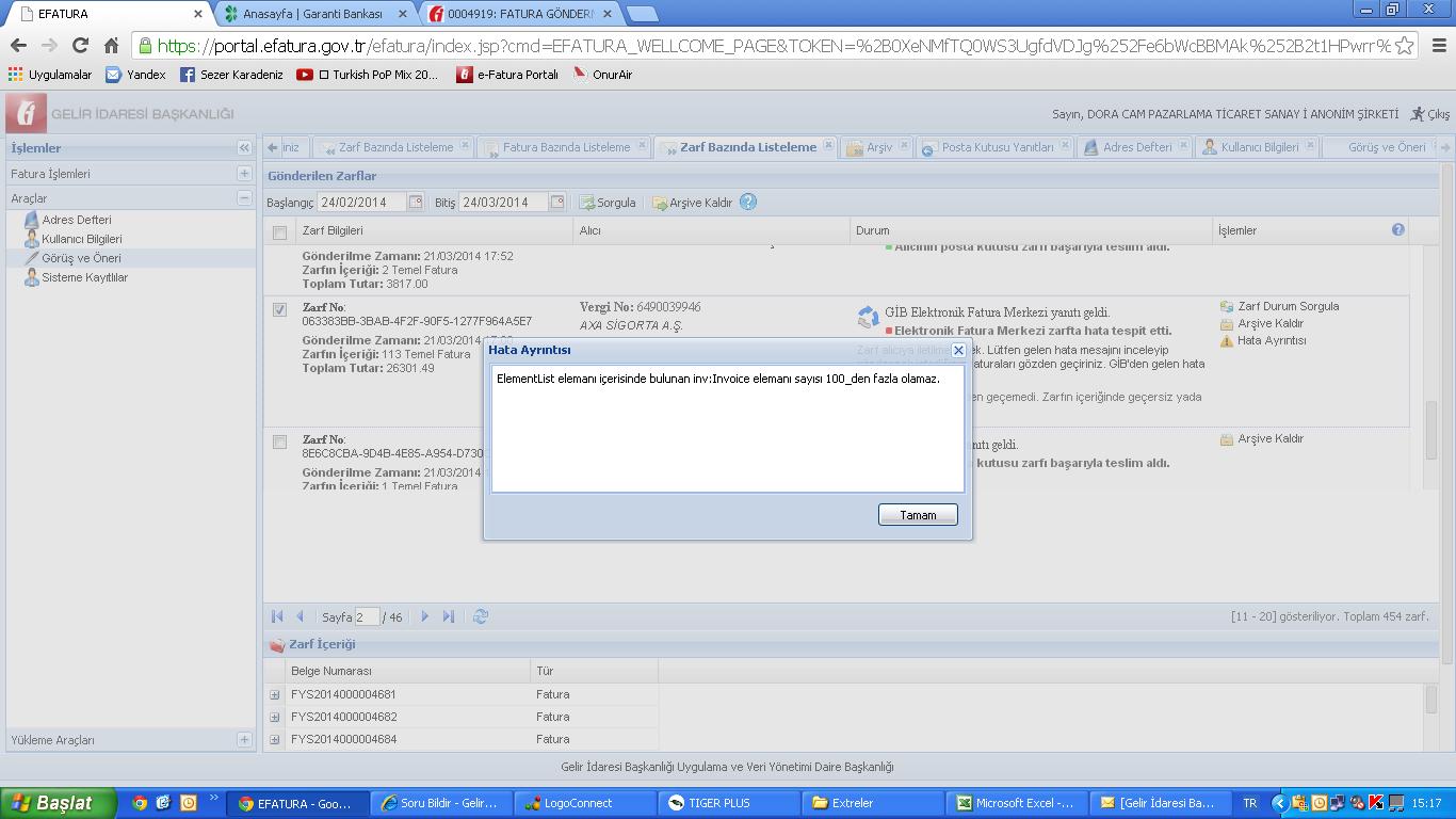 | Soru | Zarf içerik kontrolünden geçemedi. Zarfın içeriğinde geçersiz yada tutarsız bilgiler var. HATA AYRINTISI: ElementList elemanı içerisinde bulunan inv:Invoice elemanı sayısı 100_den fazla olamaz. Merhaba, Gönderdiğimiz zarfta sadece aynı alıcı için hata alıyoruz. ayrıca zarfın içinde 50 den az fatura bulunmaktadır. Daha önceki gönderilerde sorun yaşanmamıştı ve 1 kaç tane gönderi yapıldığında alıcıya iletiliyor. ekte hata resimleri de bulunmaktadır. | |||||||