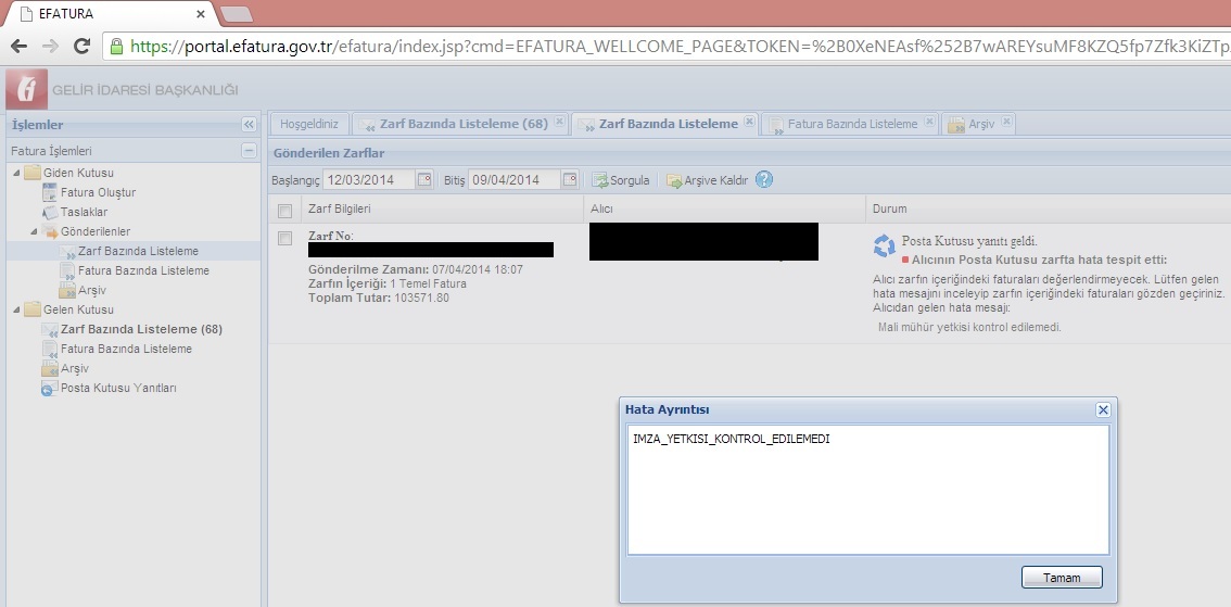 HEDEFTEN SISTEM YANITI BASARISIZ GELDI(1175:IMZA_YETKISI_KONTROL_EDILEMEDI) 1230